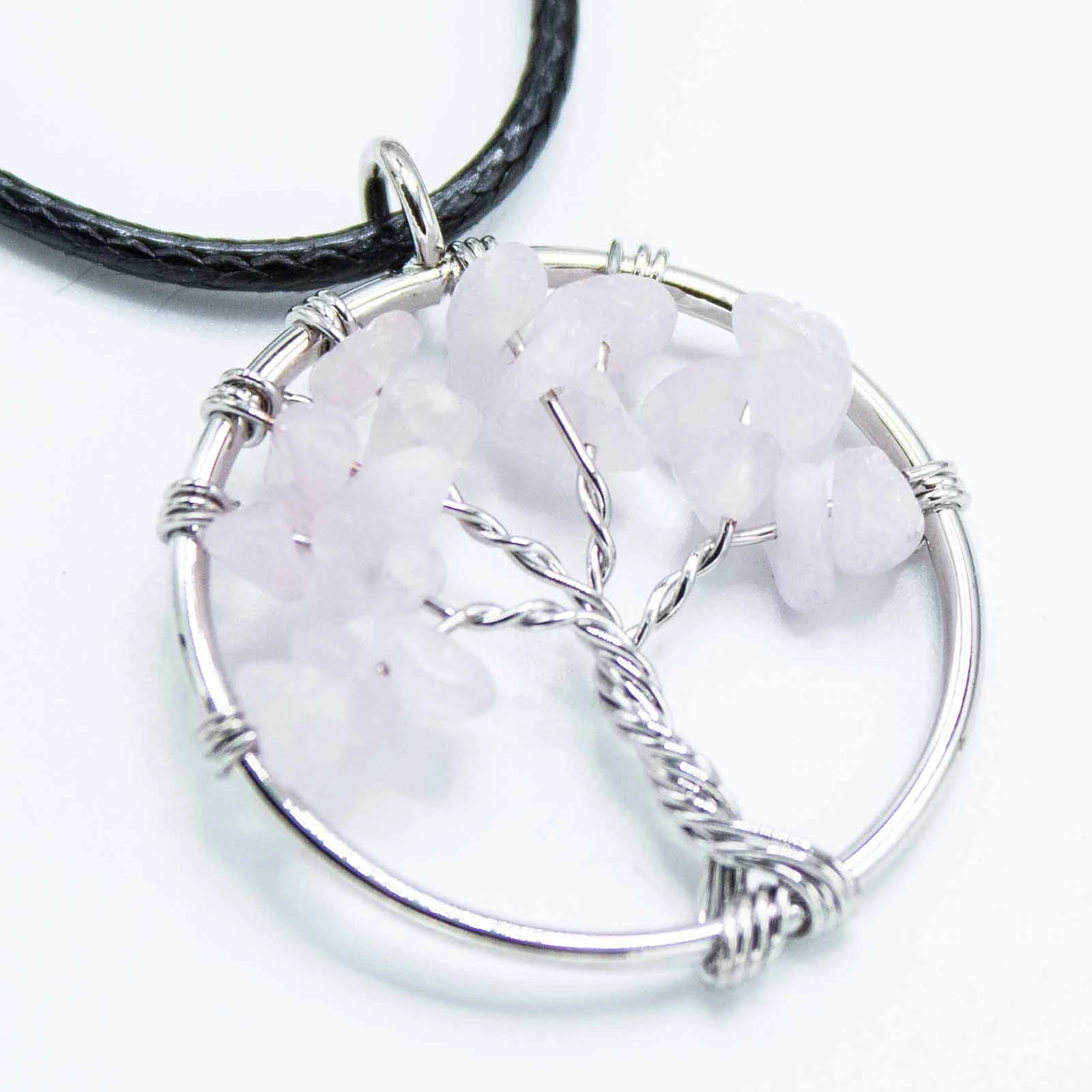 Anyag/Összetevők: természetes rózsakvarc kristály, fém Életfa medál, szarvasbőr pánt.